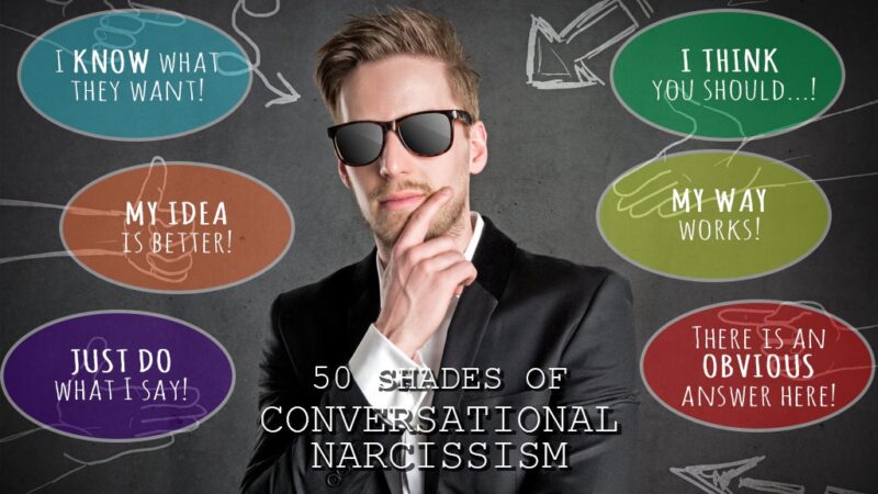 Here are 5 shades (sorry, not enough page space for 50 – but the book is coming!) of conversational narcissism that you might find yourself falling into, and a few tips on what you can do about changing it.